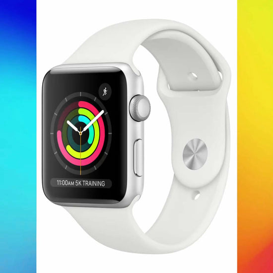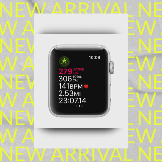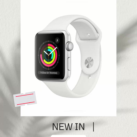 Good things come in 3. See how much you move, exercise, and stand daily, and track every way you work out. Listen to your favorite music. Text, call, and email. Pay for lunch, and get a tap when it’s time to turn while getting directions. Series 3 lets you do it all, right from your wrist. *- Keep motivated by tracking your daily activity on Apple Watch and seeing trends on iPhone *- Measure workouts like running, walking, cycling, yoga, swimming, and dance, plus new tai chi and pilates *- High and low heart rate notifications and irregular heart rhythm notification 1 *- Emergency SOS lets you call for help from your watch 2 *- Take calls and reply to texts, right from your wrist *- View notifications at a glance on the Retina display *- Sync music, podcasts, and audiobooks to your watch and enjoy them on the go *- Swimproof design 3 *- watchOS 8 features new workout types and enhancements to Messages Apple Watch Series 3 requires an iPhone 6s or later with iOS 15 or later. 1 Irregular rhythm notification requires the latest versions of watchOS and iOS. It is not intended for use by people under 22 years old or those who have been previously diagnosed with atrial fibrillation (Afib). 2 To use Emergency SOS, your iPhone needs to be nearby. If your iPhone isn’t nearby, your Apple Watch needs to be connected to a known Wi-Fi network and you must set up Wi-Fi Calling. 3 ISO standard 22810:2010. Appropriate for shallow-water activities like swimming. Submersion below shallow depth and high-velocity water activities not recommended. *- GPS and a barometric altimeter track how far and high you go *- Dual-core processor for faster app performance (2) *- Ultimate sports watch and intelligent activity tracker *- Swimproof so you're always read for the pool or ocean (3) *- Alumninum case *- watchOS 4 is even more intuitive and intelligent *- Condition: New 1. Apple Music requires a subscription 2. Compared with the previous generation 3. ISO standard 22810:2010. Appropriate for shallow-water activities like swimming. Submersion below shallow depth and high-velocity water activities not recommended