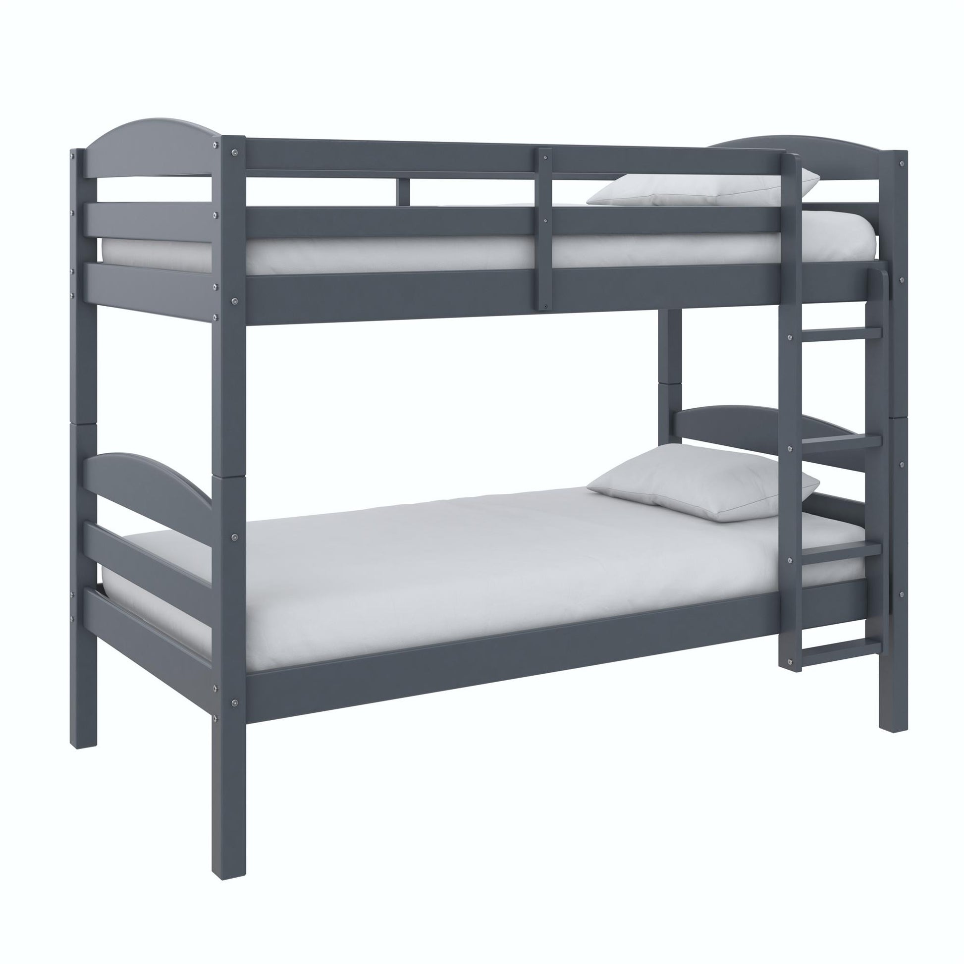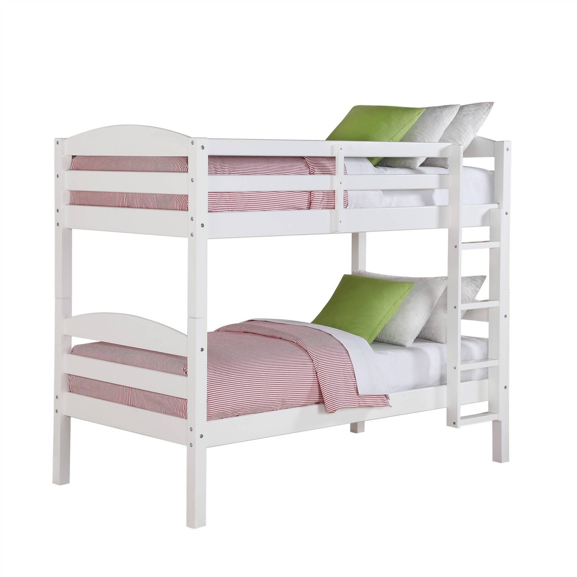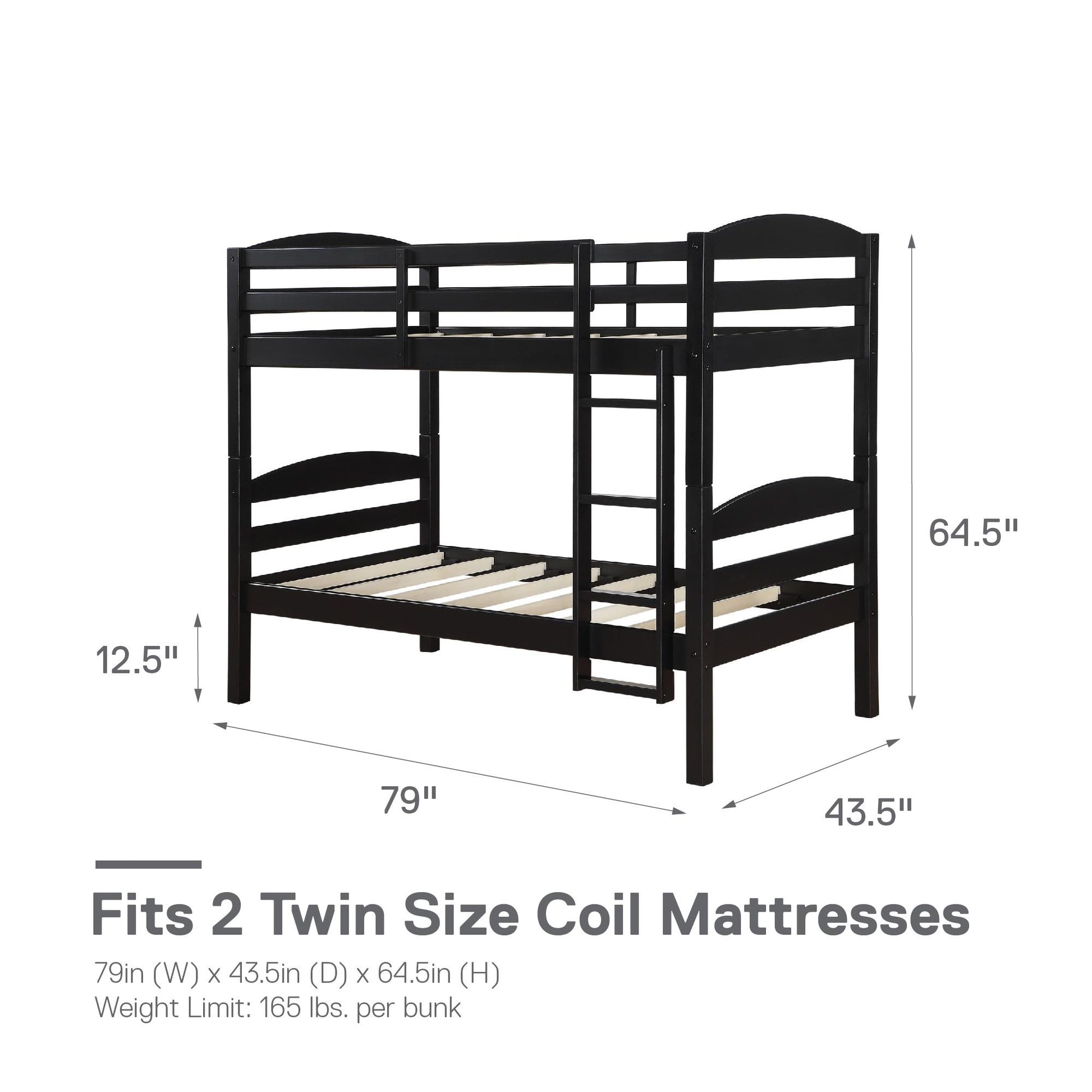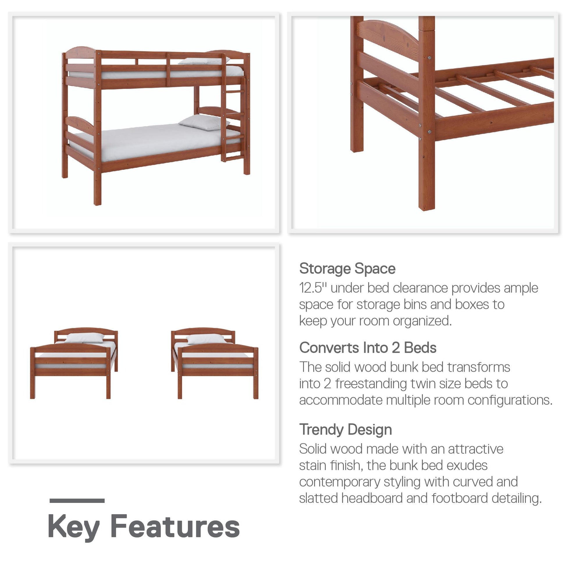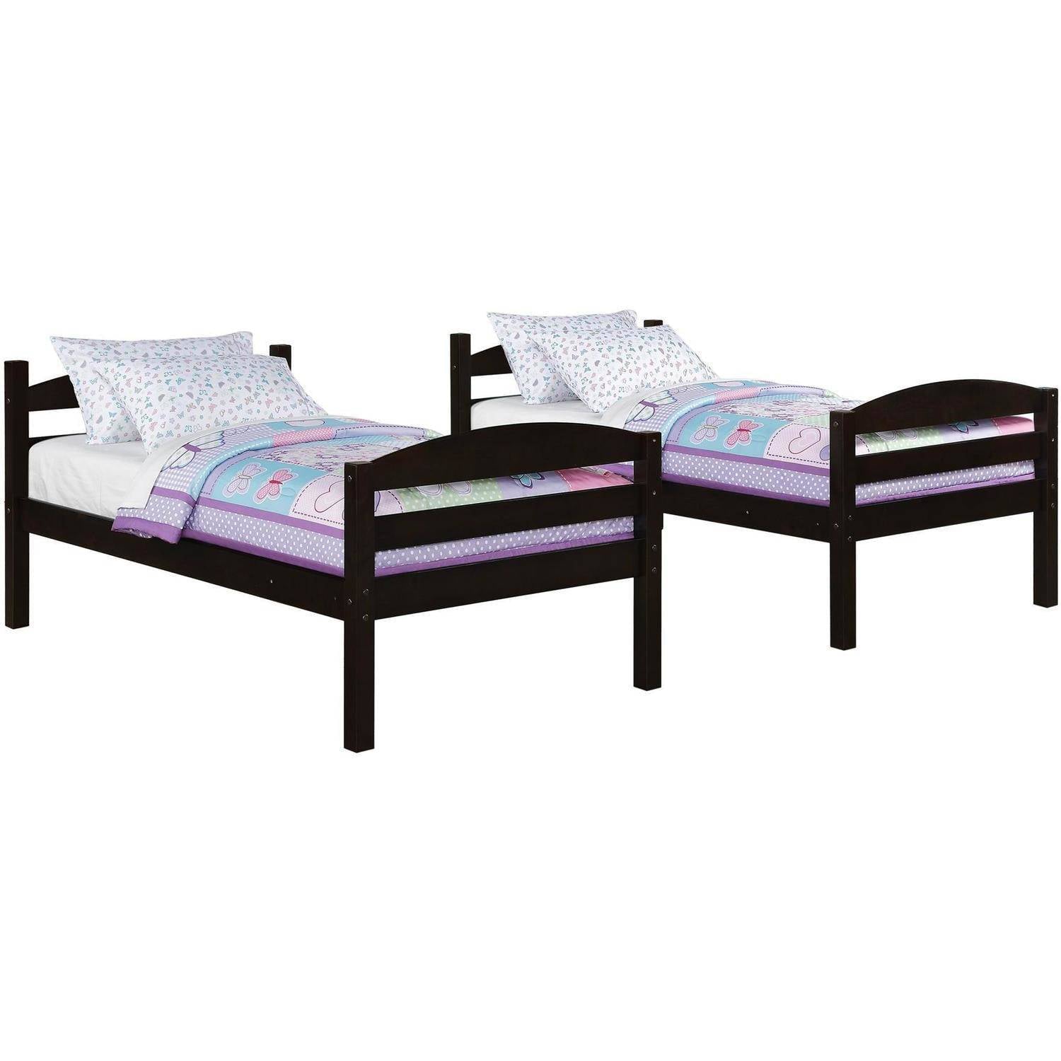 Create fun and restful environment with the Better Homes & Gardens Leighton Twin-over-Twin Bunk Bed. An American classic, its solid wood construction features clean and simple lines, creating a timeless look that easily coordinates with any room style. Available in multiple color options, the bunk bed’s horizontal slats and slightly curved headboards come together to pay homage to its Craftsman inspired design. The Leighton is equipped with two full-length guardrails on the top bunk and a secure, easy-to-climb 4-step ladder providing access for children while leaving parents worry free. The Better Homes & Gardens Leighton Twin-over-Twin Bunk Bed can be unstacked to become two stand-alone beds making this a wonderful, versatile choice your children and their friends will love. Better Homes & Gardens Leighton Wood Twin-Over-Twin Bunk Bed, Mocha *- Solid wood bunk bed for kids. Easily converts into two stand-alone twin beds. *- Designed to accommodate a mattress without a box spring. Only coil spring mattresses are to be used on both bunk levels; mattresses sold separately. *- Features one ladder to ensure safe climbing and bed support slats included for added support and durability. Top bunk designed for children ranging from 6 years of age to young teenagers. *- Meets U.S. Safety Standards. Conveniently ships in 1 box. Assembly required. 1-year limited warranty. *- Assembled Dimensions: 43.75” W x 78.75” D x 64.62” H.