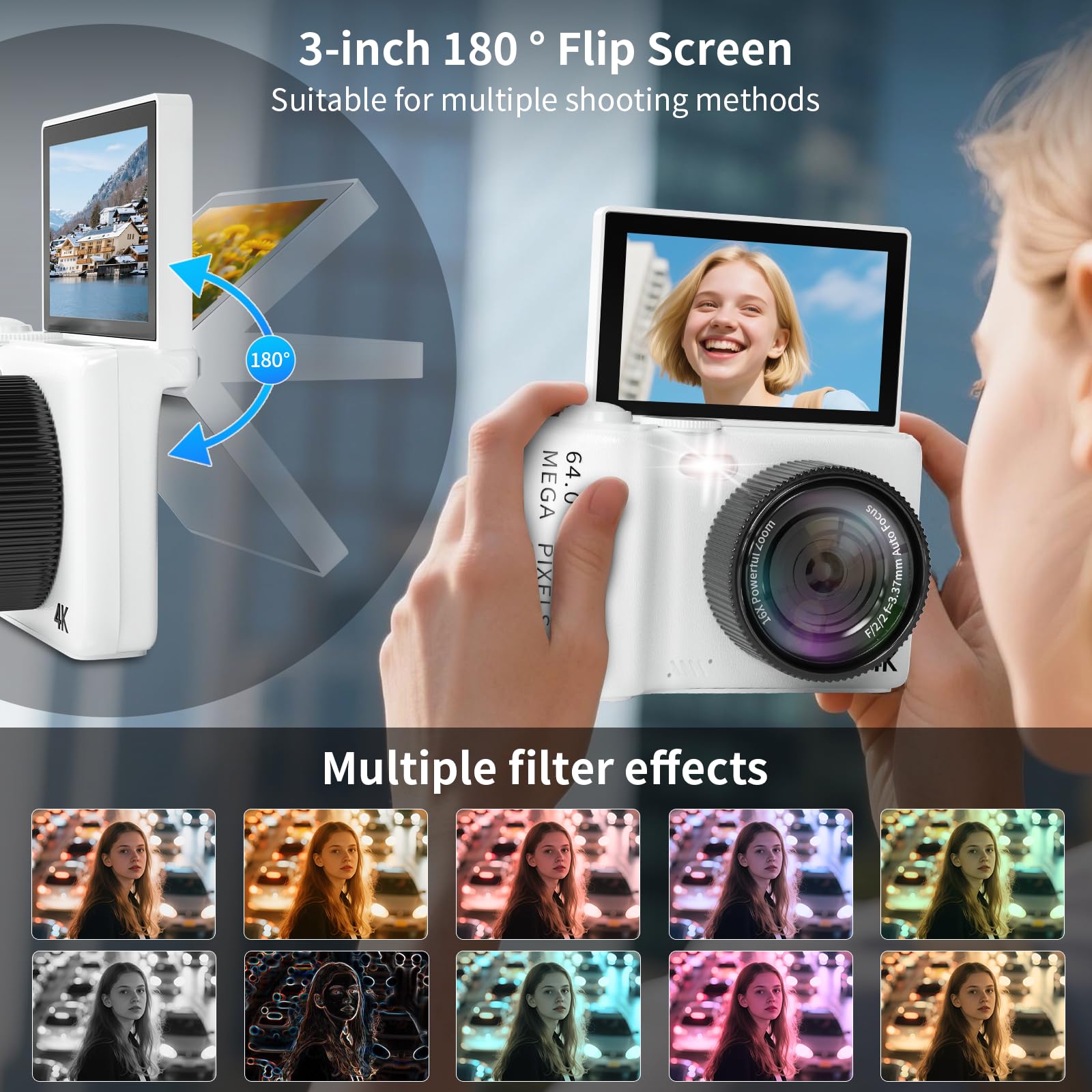 - Youtube Camera for Vlogging Beauty Features and Filters: Best digital camera for photography and video! Best camera for photography professional camera for beginners presents natural and native effects. More than a dozen filters for digital point and shot cameras for content creators allow each portrait to showcase a unique style. Point and shoot digital cameras for teens can unlock confident lenses with just one click, whether it's daily fresh makeup or exquisite makeup for party nights.